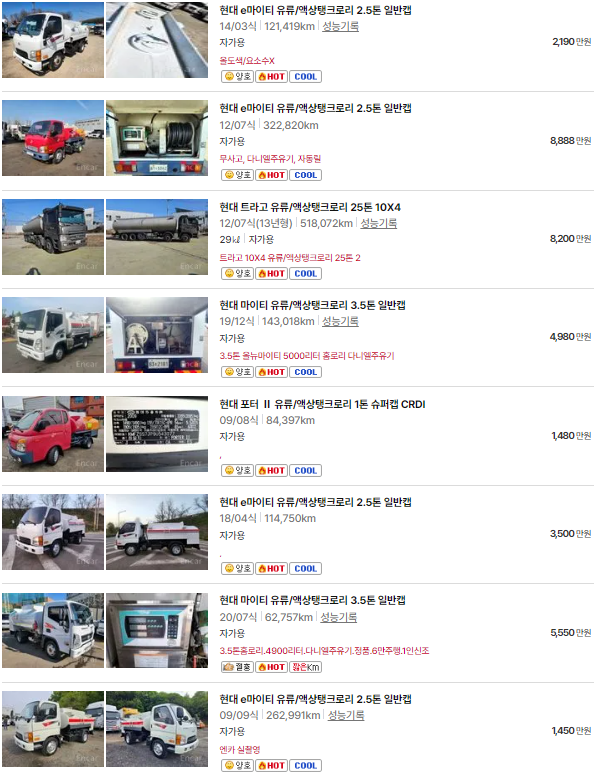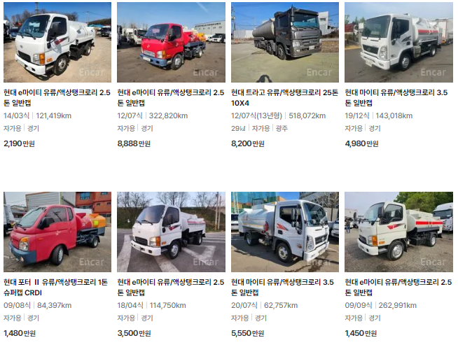 가장 이용자가 많은 엔카에는 액상 탱크로리 중고차 매물이 약 53대 등록되어 있습니다. 아래는 현재 중고차 시장에서의 액상 탱크로리 중고차 시세와 매물표입니다.