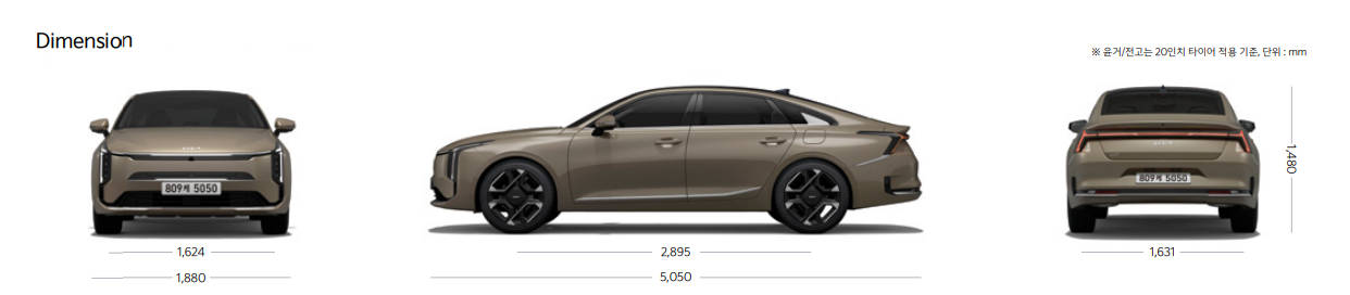 k8의 크기는 전장 5050mm, 전폭 1880mm, 전고 1455~1480mm, 축거 2895mm입니다.