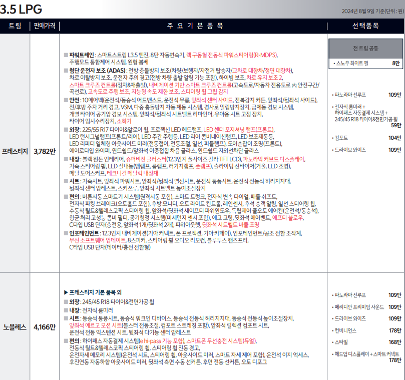 - 엔진: 스마트스트림 가솔린 2.5, 스마트스트림 LPI 3.0, 스마트스트림 하이브리드 1.6 터보