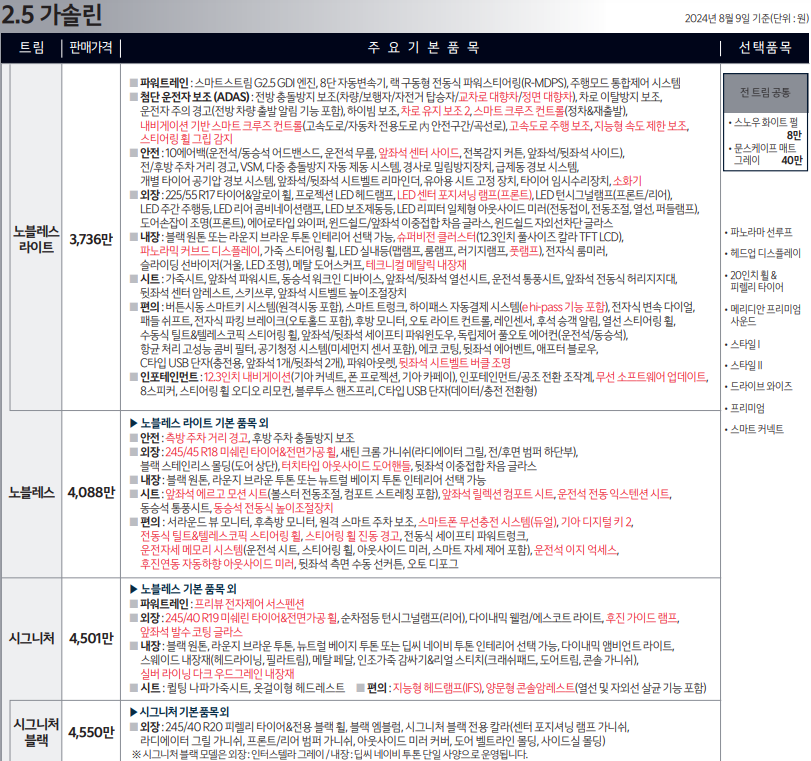 - 안전 사양: 전방 충돌 방지 보조, 차로 이탈 방지 보조, 운전자 주의 경고, 스마트 크루즈 컨트롤 등